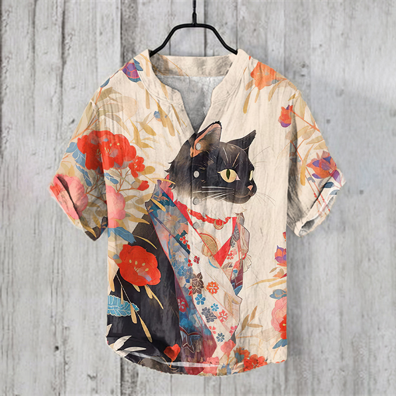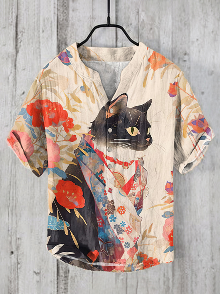 Japanese Art Cat Print Linen V-Neck Shirt