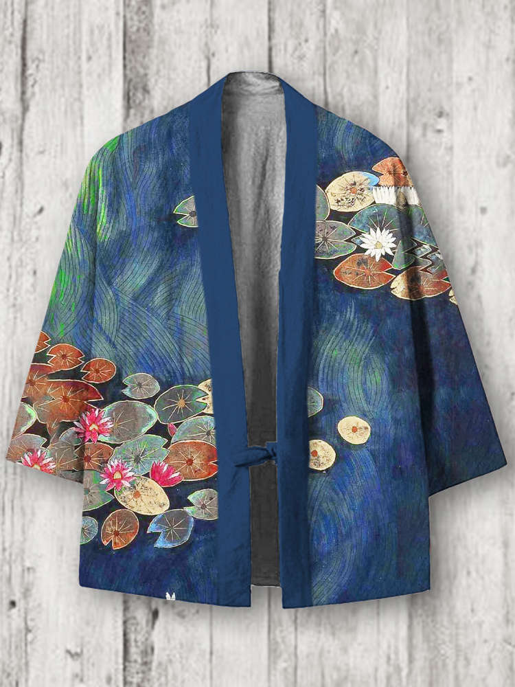 Japanese Lotus Leaf Print Linen Blend Kimono Cardigan