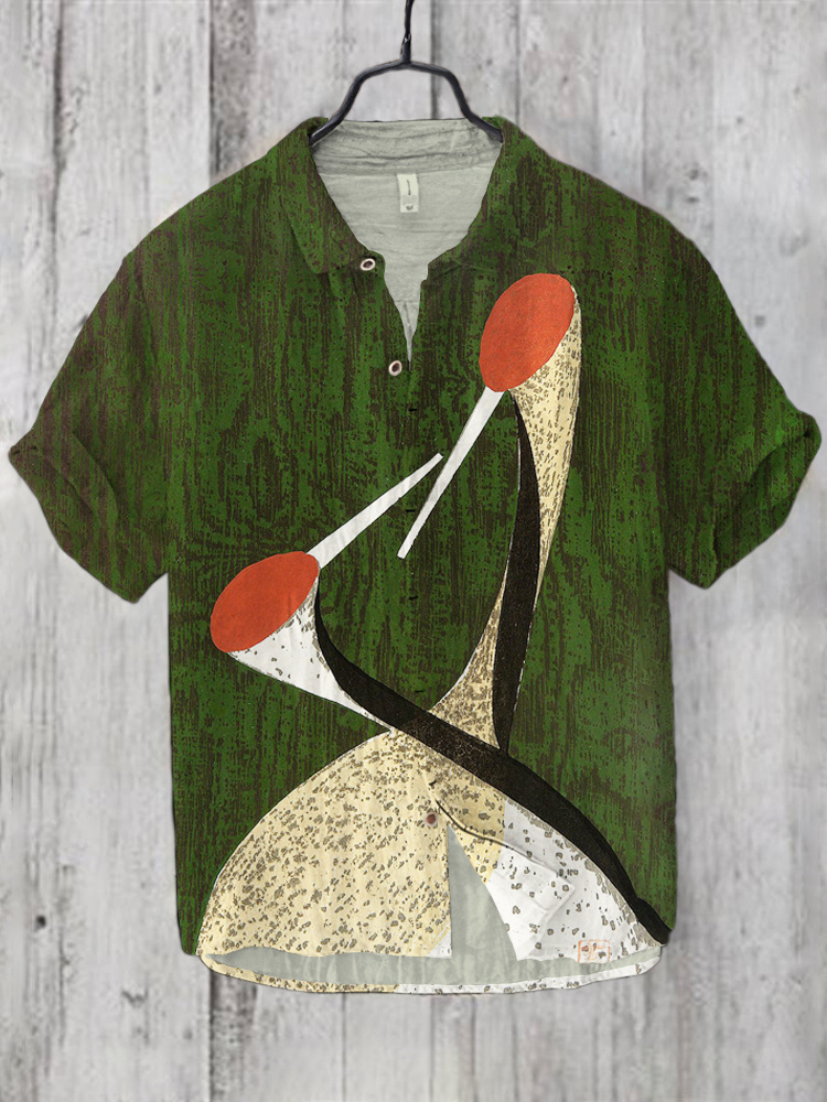 Couple Crane Japanese Art Linen Short Sleeve Shirt