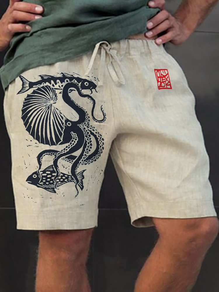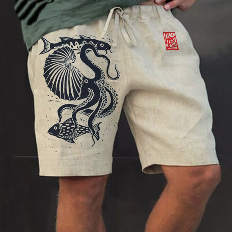 Men'S Fish Octopus Japanese Art Print Casual Shorts