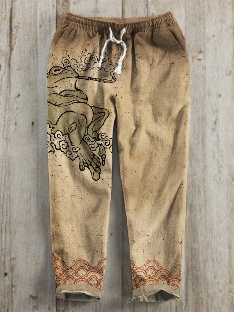 Japanese Pipe Frog Vintage Print Linen Drawstring Trousers