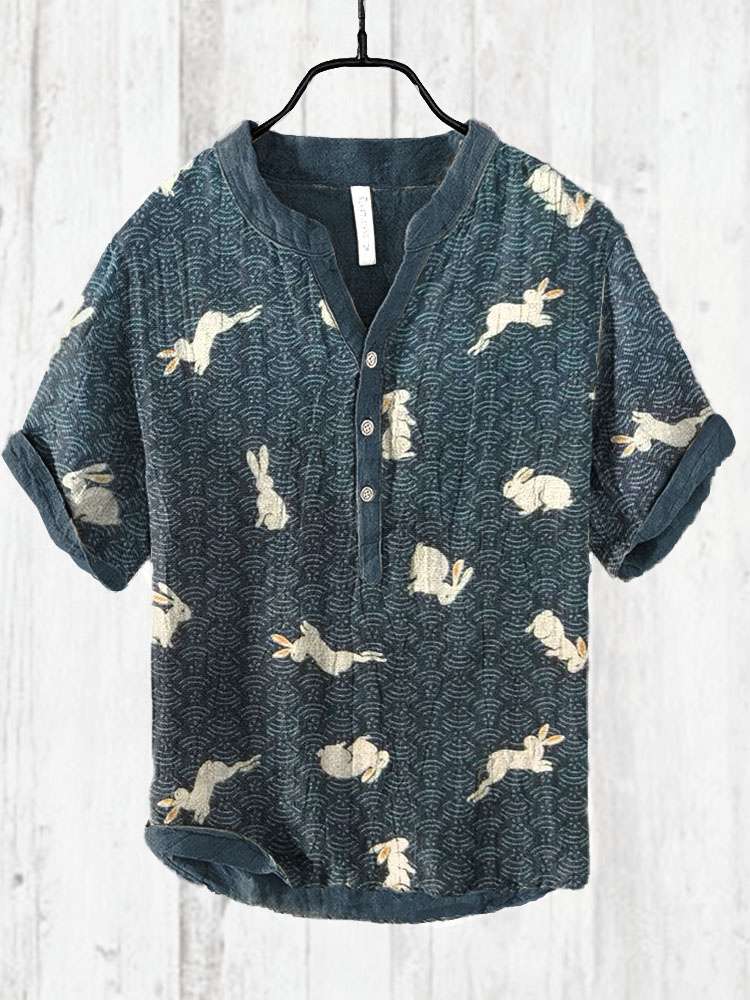 Bunnies and Waves Pattern Cozy Cotton Linen Shirt