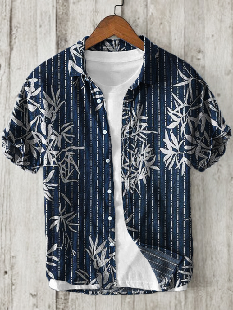 Leaves Striped Japanese Lino Art Linen Blend Shirt
