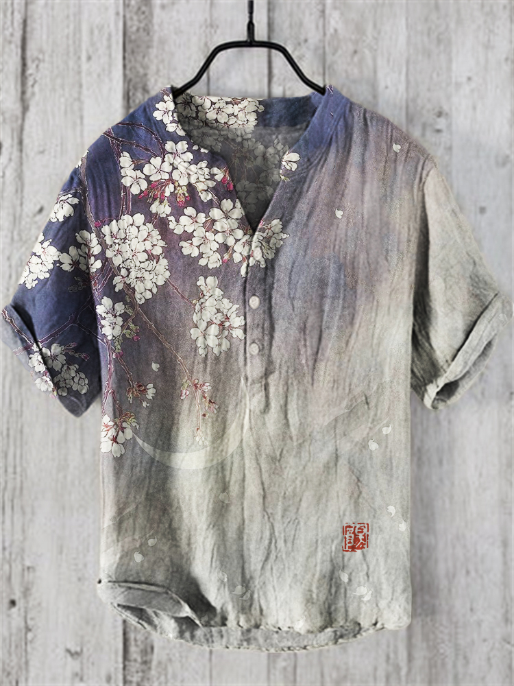 Men's Vintage Japanese Art Floral Moon Casual Linen Blend Shirt