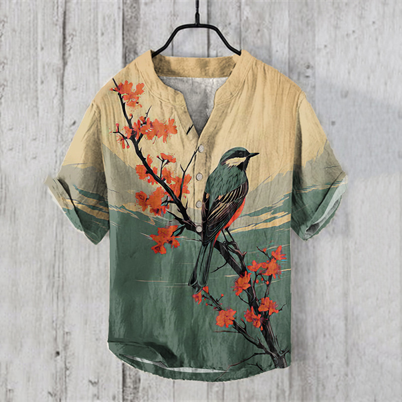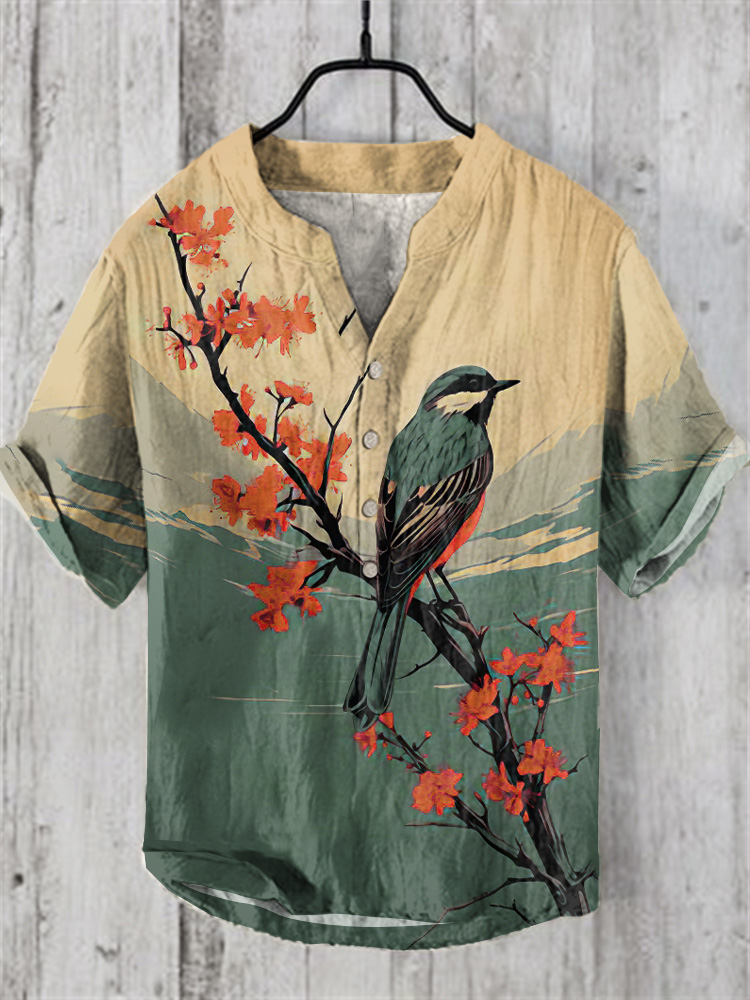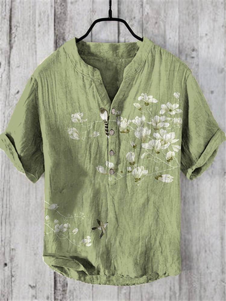 Vintage Japanese Magnolia Flower&bird Casual Linen Blend Shirt