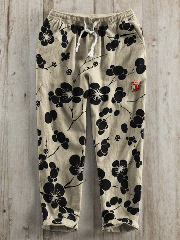 Cherry Blossom Japanese Lino Art Linen Blend Casual Pants