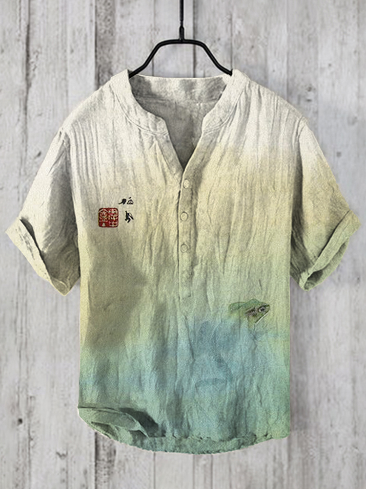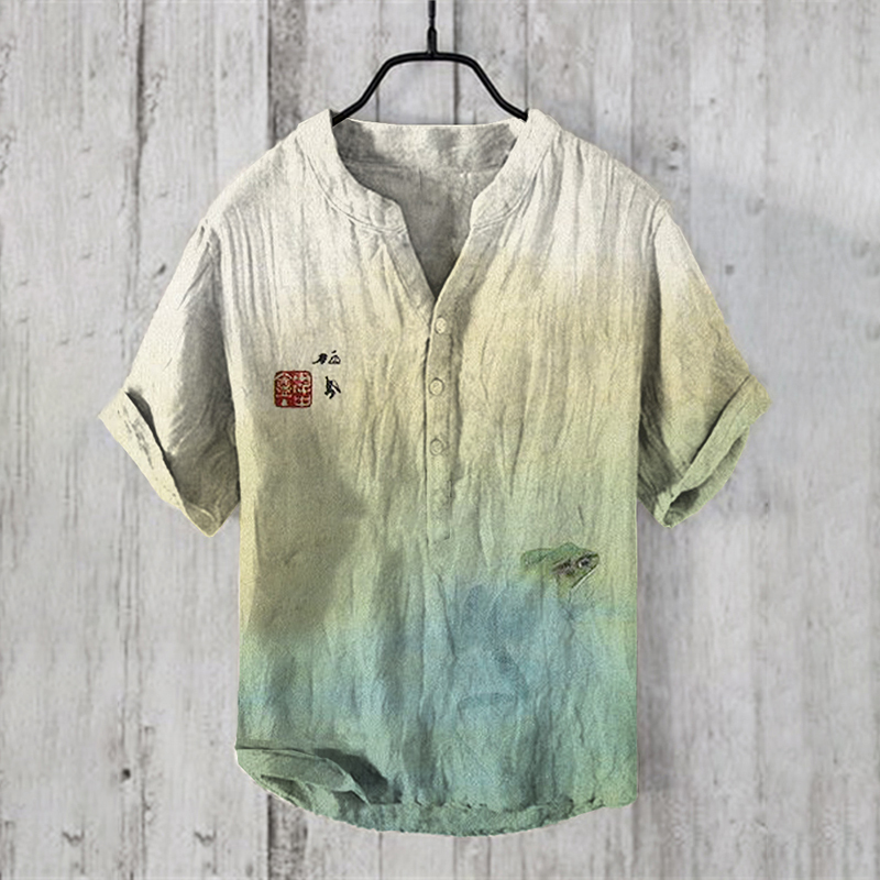 Pond Frog Japanese Art V-Neck Linen Blend Cozy Shirt