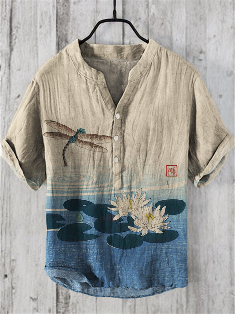 Dragonfly & Lotus Pond Japanese Art Linen Blend Shirt