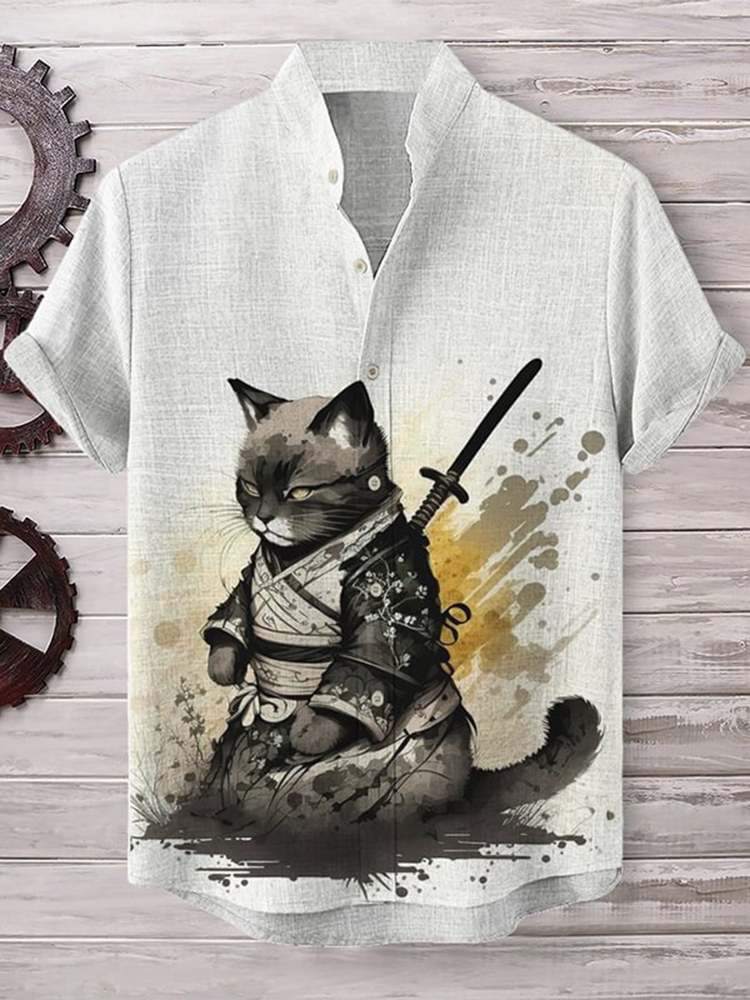 Men's Retro Handsome Samurai Cat Art Painting Print Short Sleeve T-Shirt