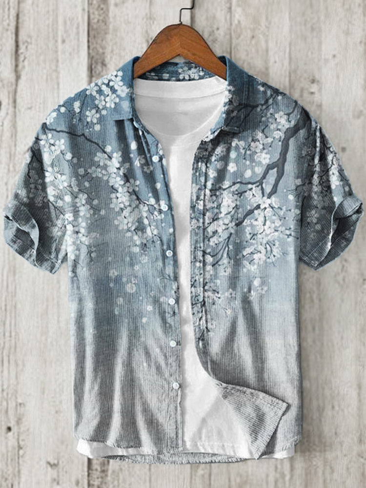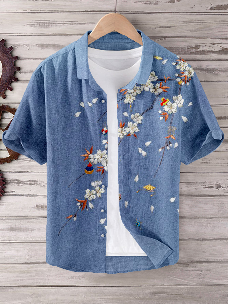 Cherry Blossom Japanese Art Short Sleeve Linen Blend Shirt