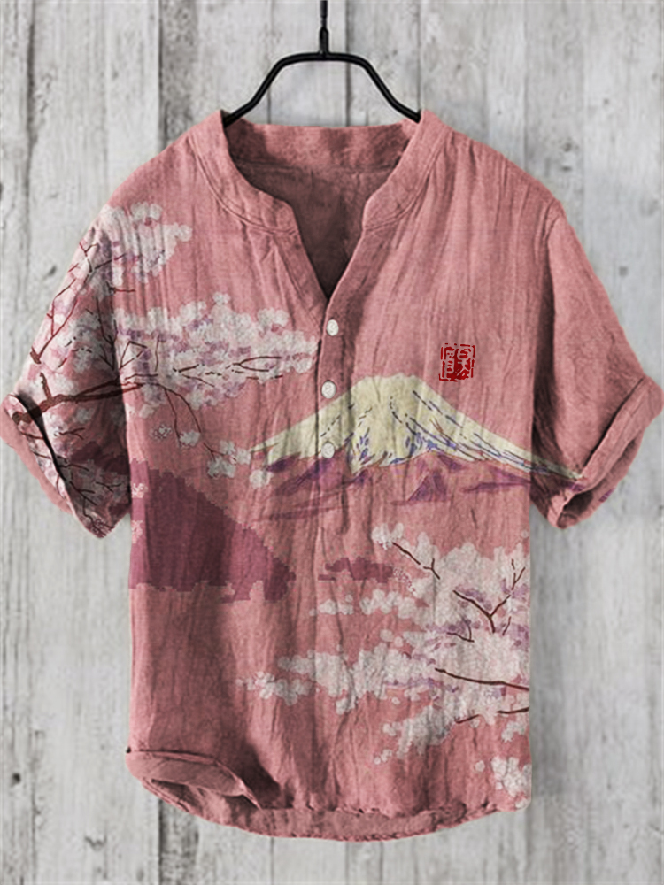 Cherry Blossom Mount Fuji Japanese Landscape Linen Blend Shirt