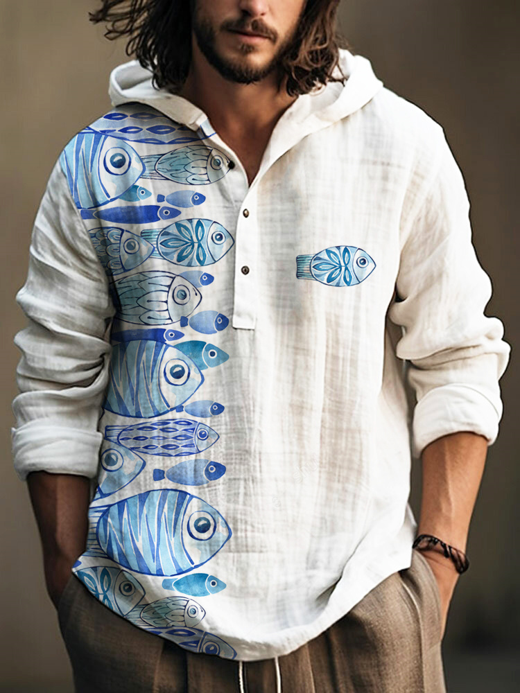 Watercolor Ocean Fish Print Linen Hooded Long Sleeve Shirt
