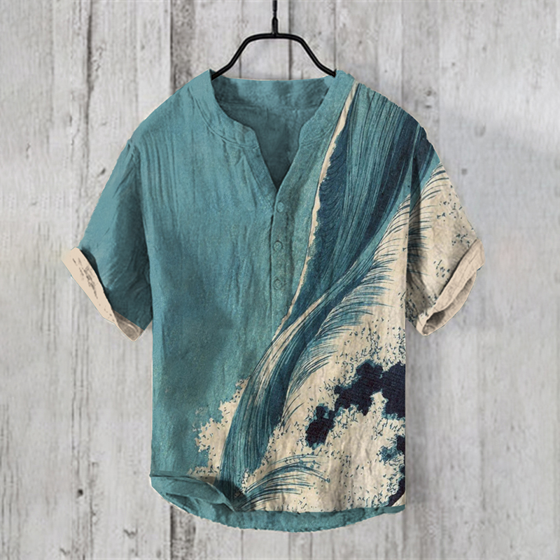Men's Retro Ocean Waves Japanese Art Linen Henry Collar Shirt