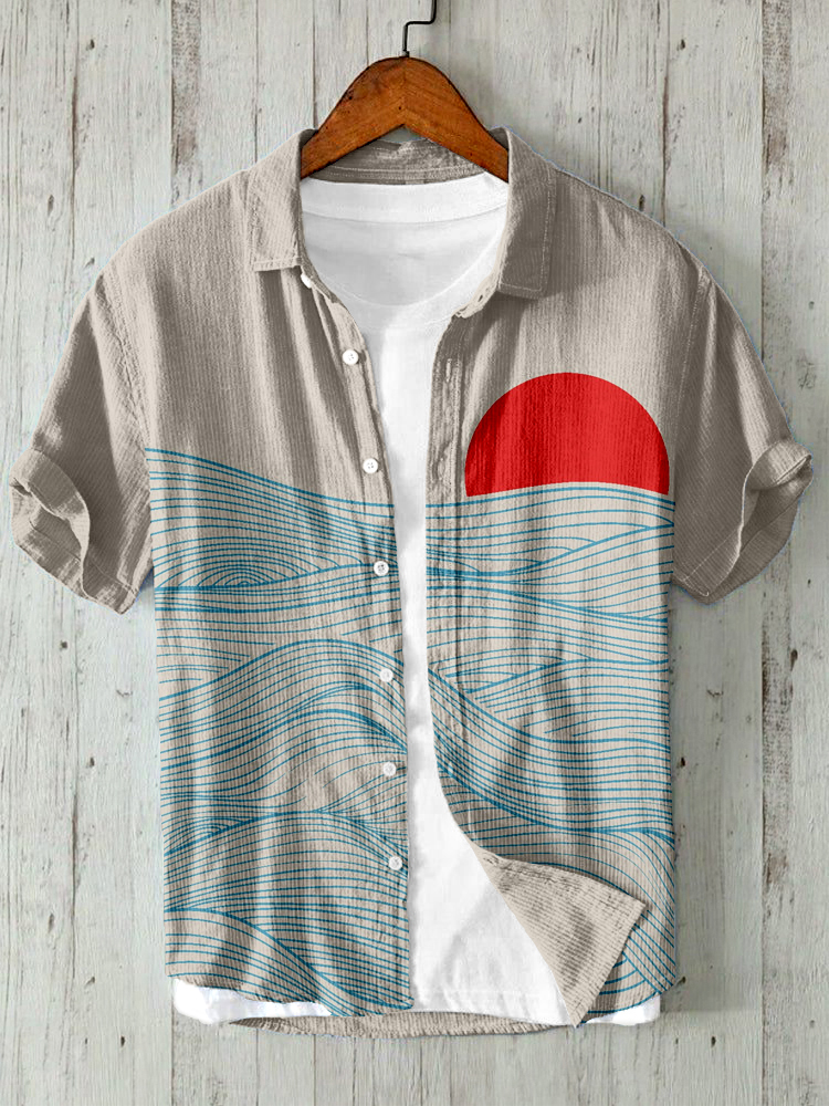Vintage Japanese Waves & Sun Art Linen Blend Shirt
