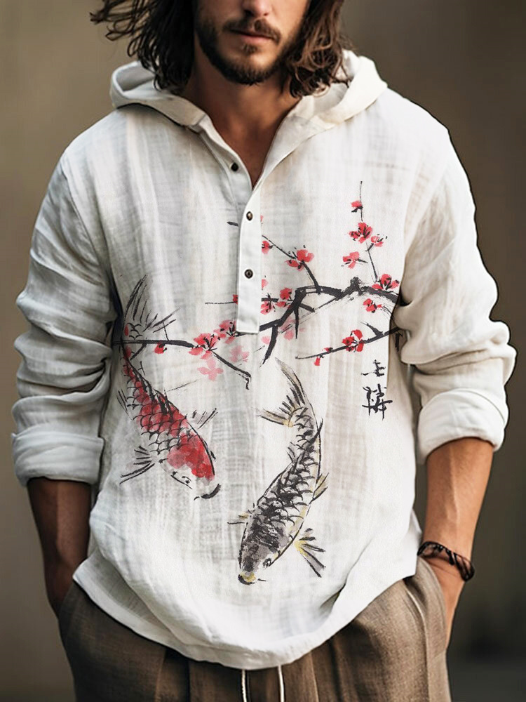 Koi & Plum Japanese Art Linen Hooded Long Sleeve Shirt