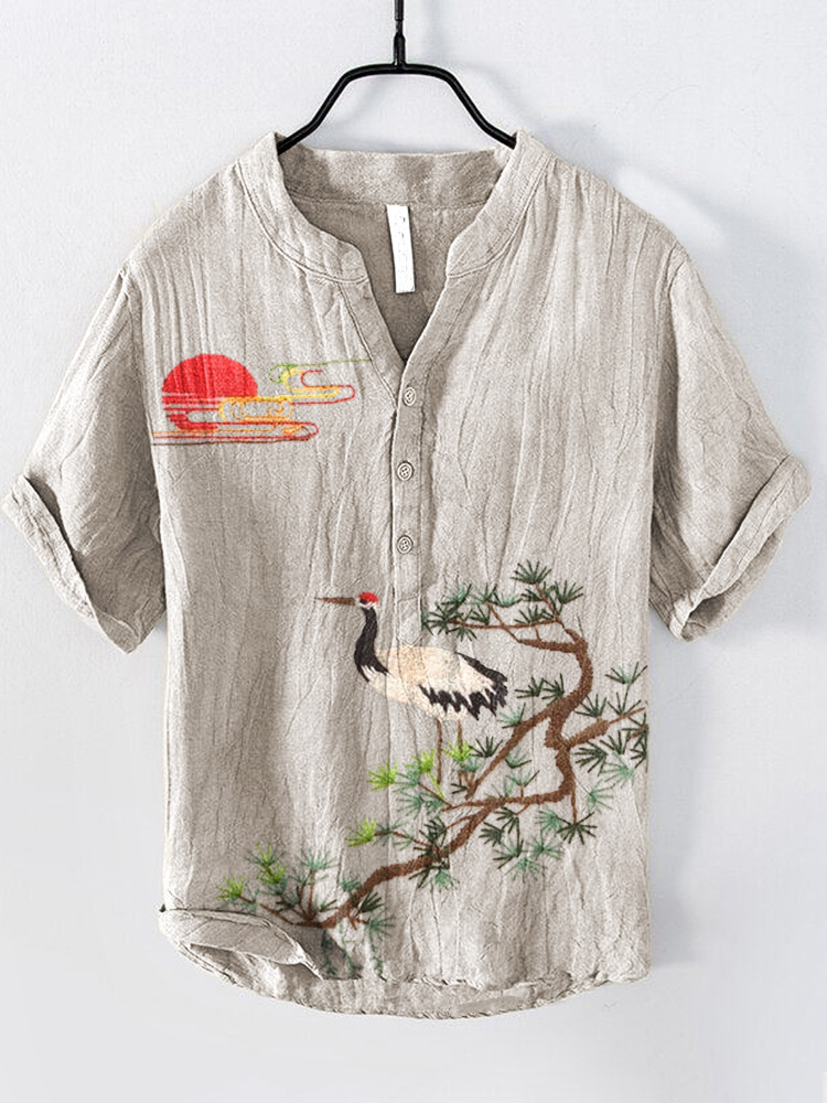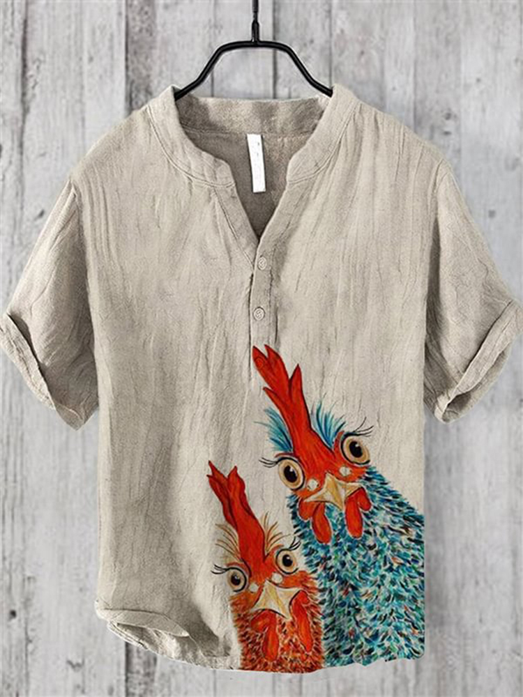 Bird Fun Art Print Short Sleeve Cotton And Linen Shirt