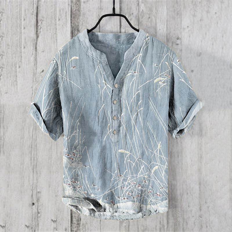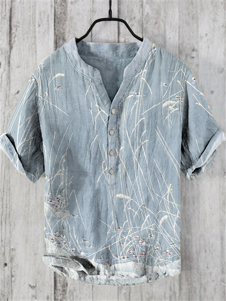 Men'sVintage Japanese Birds Waves Art Prints Linen Blend Shirt