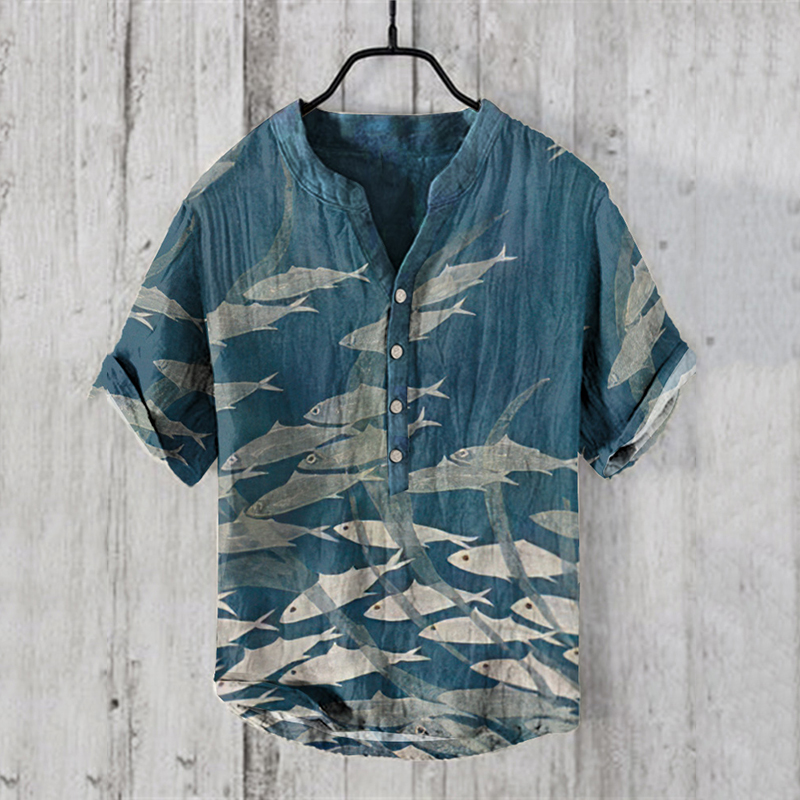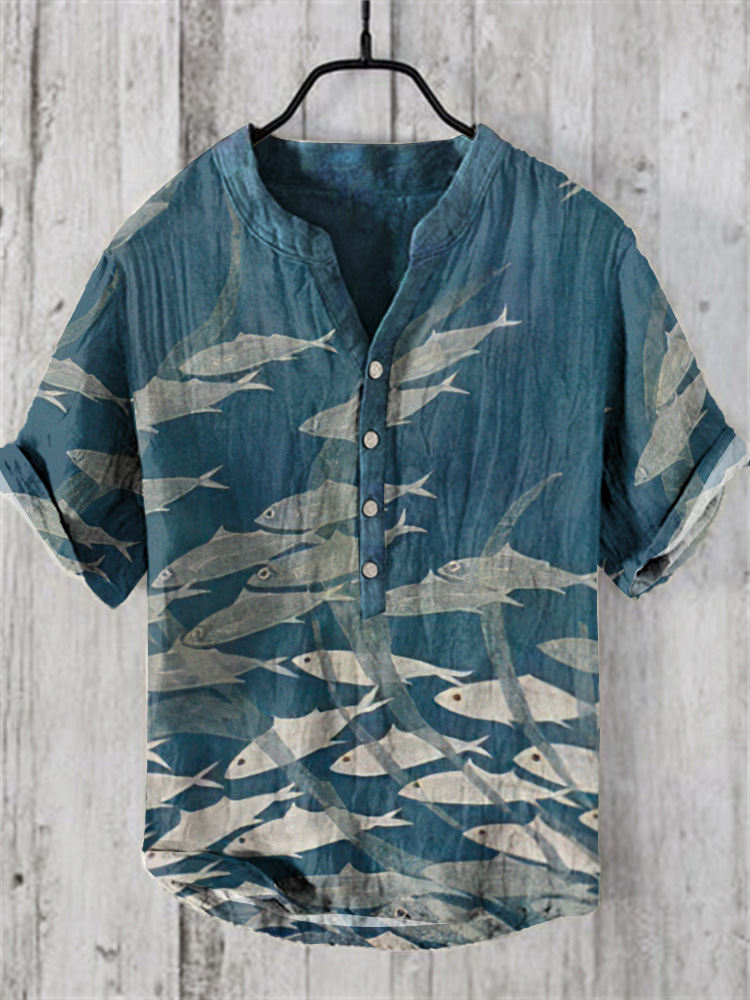 Japanese Fish Art Print Linen Blend Cozy Shirt
