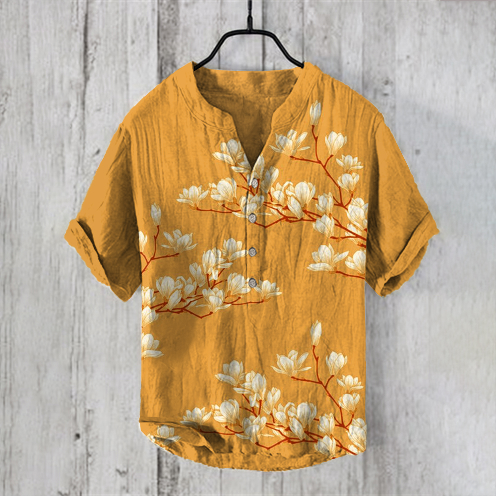 Vintage Japanese Magnolia Flower Casual Linen Blend Shirt