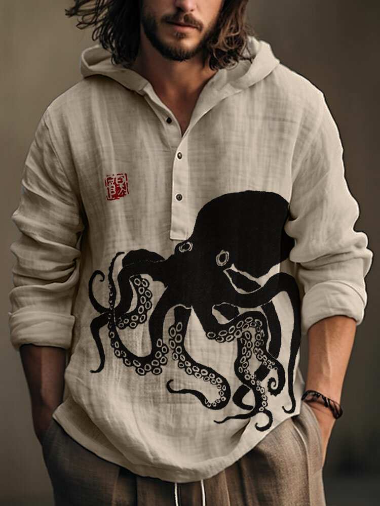 Octopus Japanese Lino Art Linen Blend Hooded Shirt