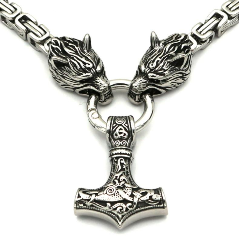 Viking series accessories necklace pure handmade chain stainless steel wolf head Thor's hammer men's Nordic jewelry