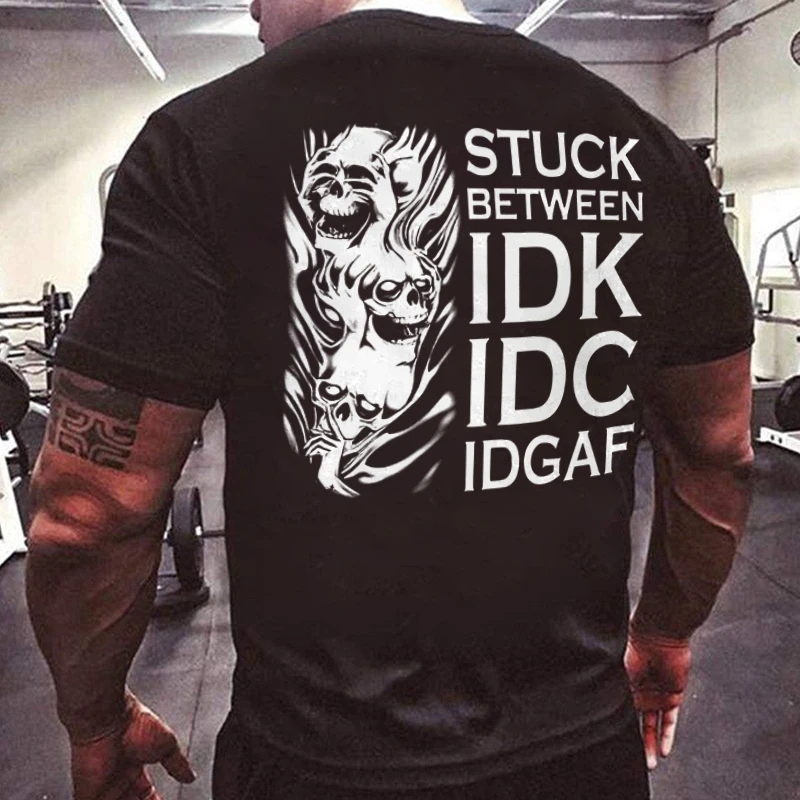 Stuck Between IDK IDC IDGAF Funny Skulls Printed T-shirt