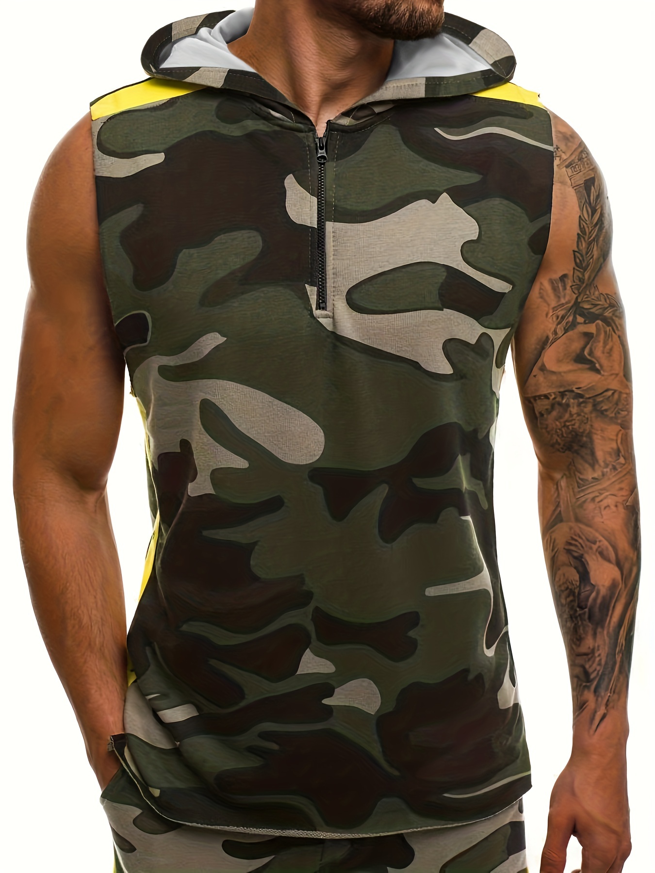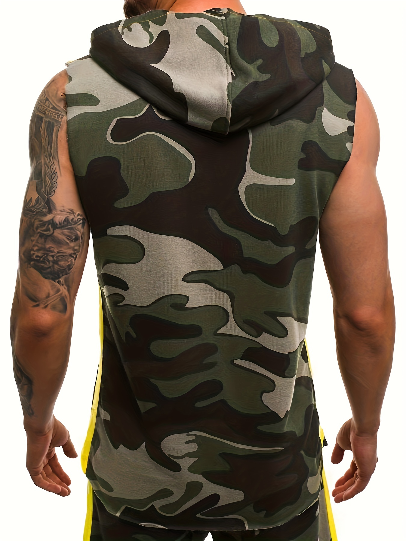 Plus Size Men's Camouflage Hooded Tank Top With Zipper For Summer, Street Style Sleeveless Hoodies For Males