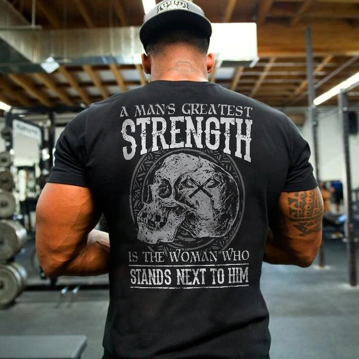 A man's greatest strength is the woman who stands next to him printed Men's T-shirt