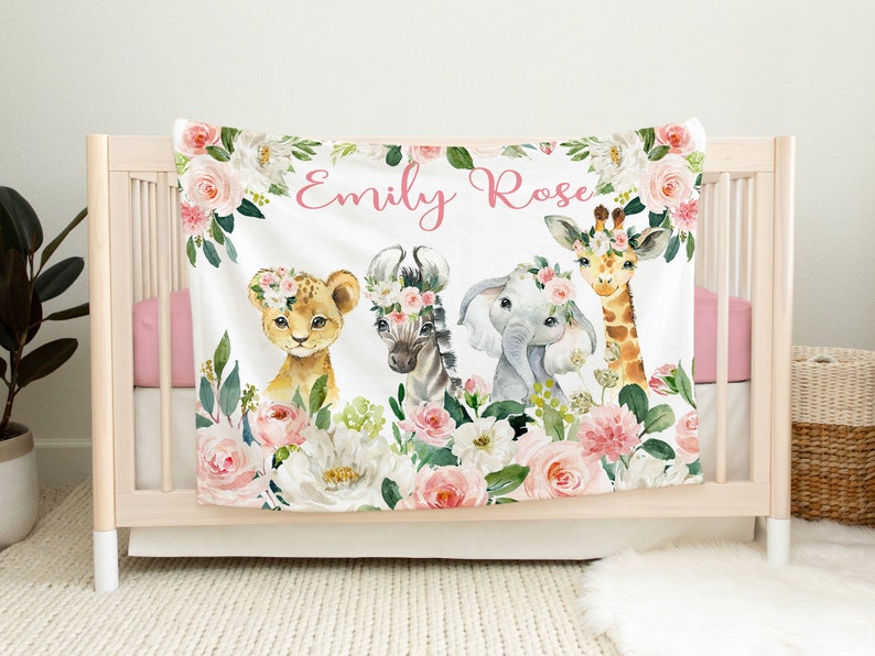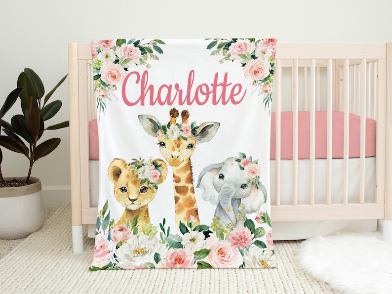 Safari Animals Floral Jungle Baby Blanket Blush Pink Gold Flowers Name Blanket Newborn Monogram Baby Shower Gift