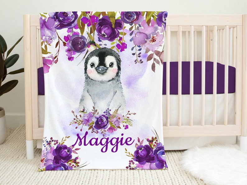 Penguin Baby Blanket Floral Purple Lavender Plum Flowers Newborn Name Blanket Monogram Flowers Baby Shower Gift Bedding