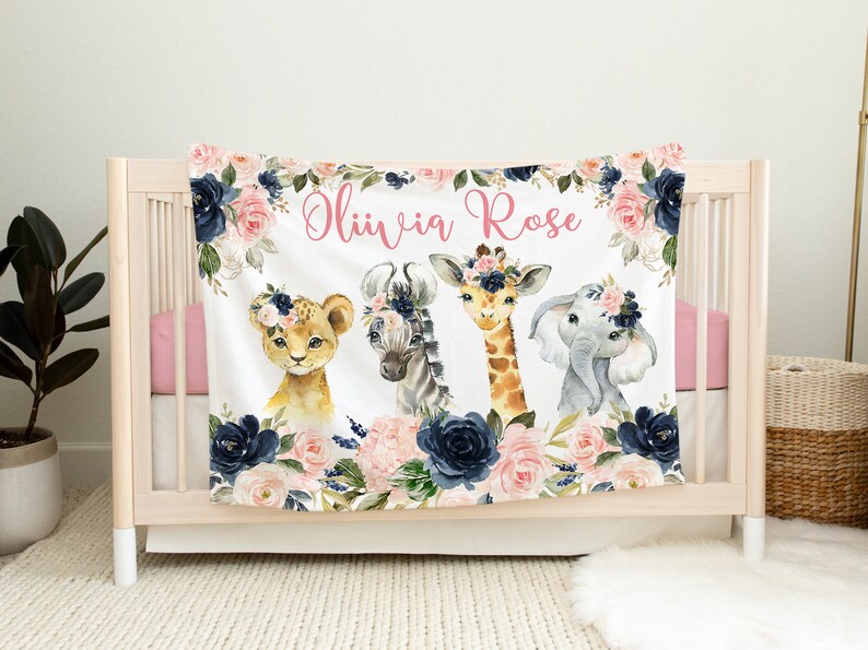 Animals Baby Floral Blanket, Blush Pink Navy Flowers Safari Jungle Name Blanket, Newborn Baby Shower Gift, Floral