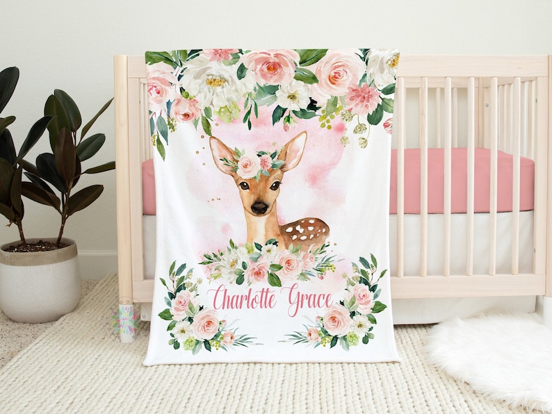 Deer Baby Name Blanket, Blush Pink Floral Personalized Newborn Baby Monogram Flowers Baby Shower Gift Bedding