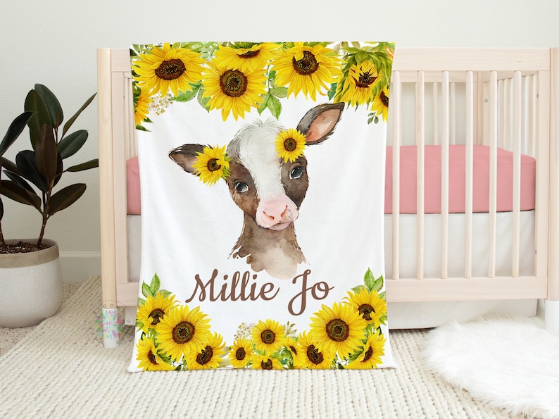 Cow Sunflower Baby Blanket, Farm Animals Personalized Watercolor Flowers Baby Shower Gift Newborn Nursery Sunflower