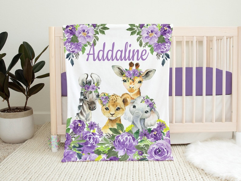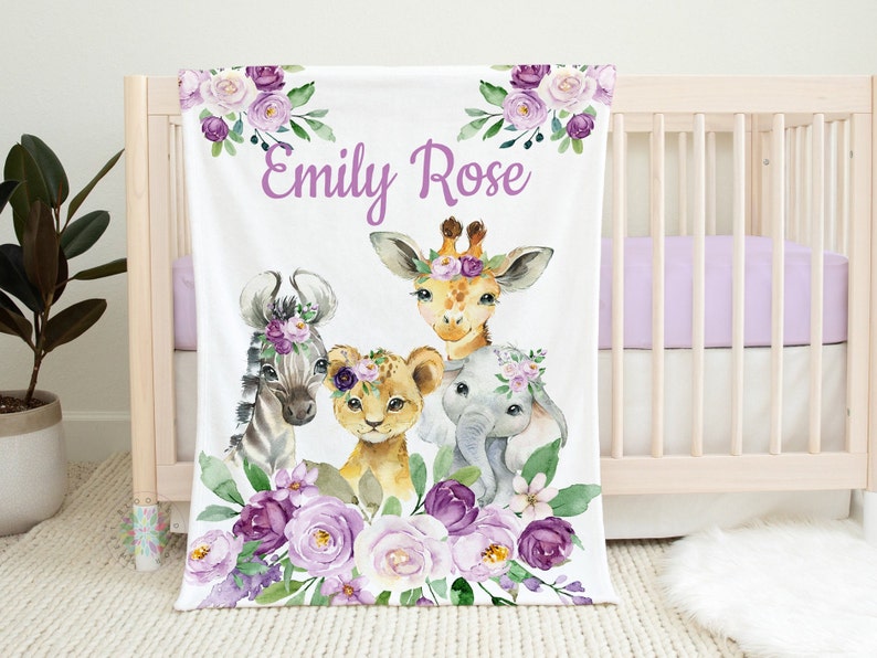 Safari Animals Baby Name Blanket, Purple Lavender Floral Watercolor Flowers Baby Shower Gift Lion Elephant Giraffe Zebra