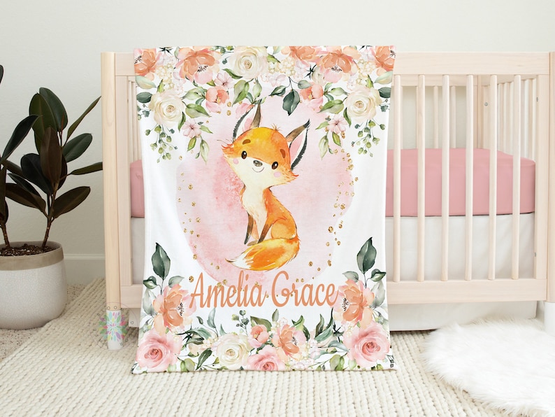 Fox Floral Name Blanket, Watercolor Blush Pink Peach Flowers Baby Personalized Blanket, Baby Shower Gift