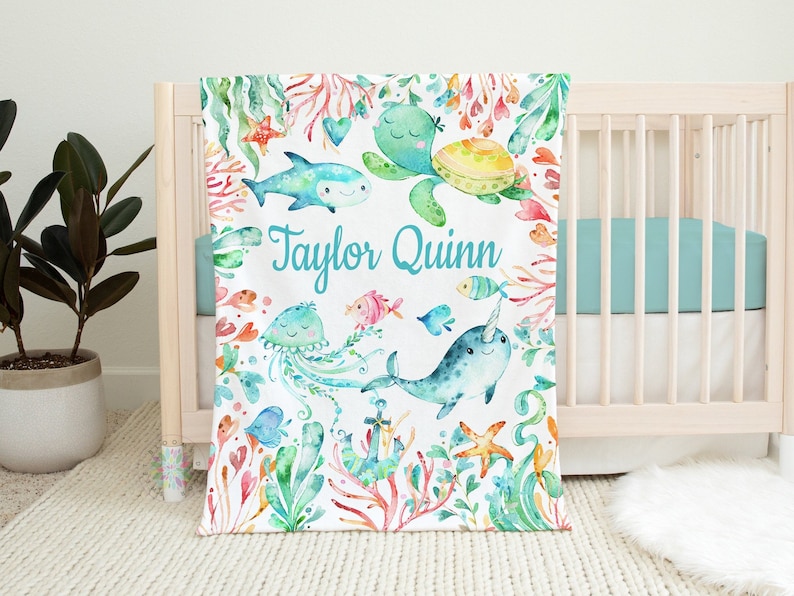 Sea Animals Baby Blanket, Personalized Under The Sea Turtle Jelly Fish Narwhal Shark Gender Neutral Baby Shower Gift Blanket