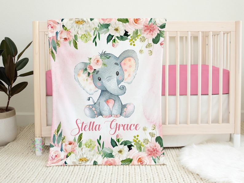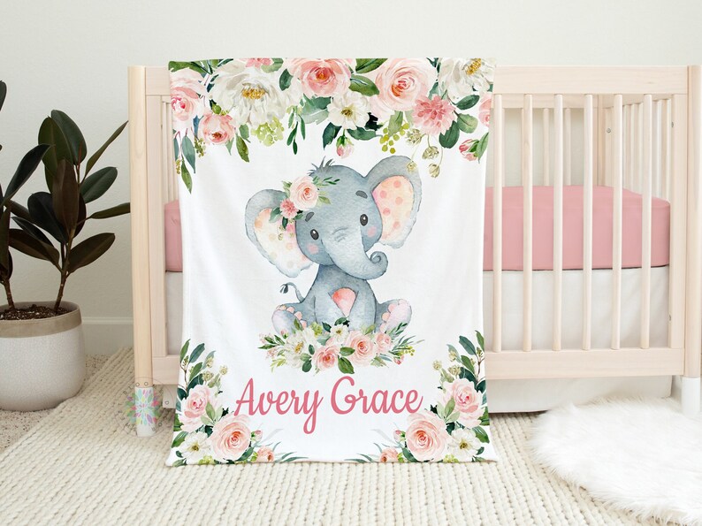 Elephant Baby Blanket, Pink Floral Animals Nursery Bedding Decor Personalized Name Baby Shower Gift Blush Pink Flowers Roses Name