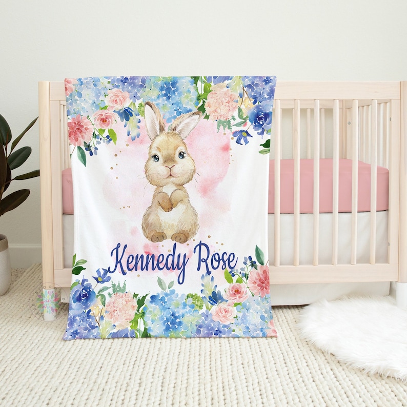 Bunny Rabbit Baby Name Blanket Blue Coral Blush Pink Watercolor Floral Personalized Swaddle Baby Shower Gift