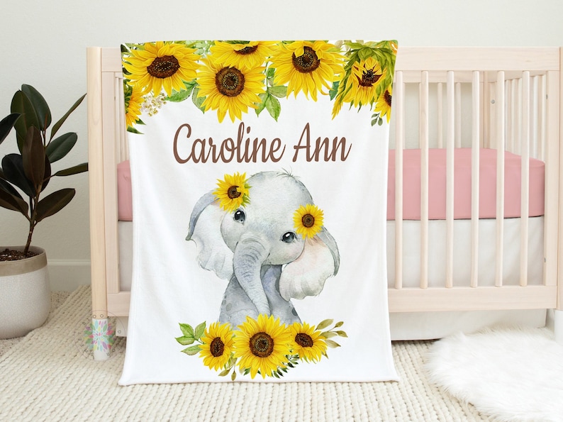 Sunflower Elephant Name Blanket Floral Personalized Watercolor Yellow Flowers Baby Shower Gift Newborn Nursery