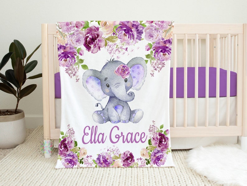 Elephant Baby Blanket, Purple Floral Personalized Name Purple Lavender Watercolor Flowers Baby Shower Gift Nursery Bedding