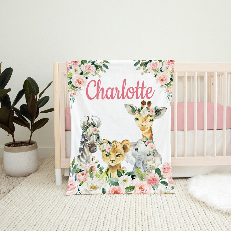 Animals Baby Blanket, Safari Floral Blush Pink Flowers Jungle Personalized Name Custom Nursery Decor Newborn Baby Shower Gift