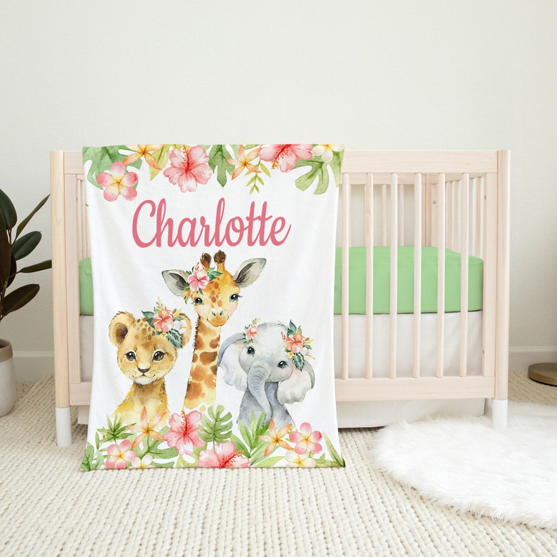 Jungle Animals Baby Floral Blanket, Personalized Safari Floral Name Blanket, Baby Shower Gift Monkey Lion Elephant Giraffe