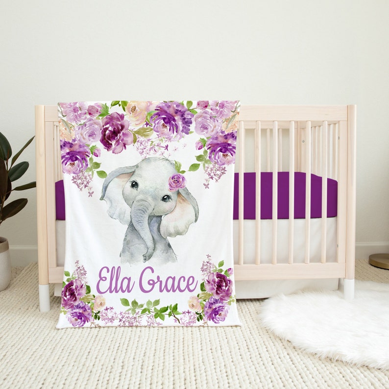 Elephant Purple Floral Blanket, Purple Lavender Lilac Flowers Personalized Blanket, Baby Shower Gift Nursery