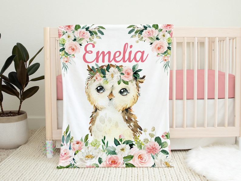 Owl Floral Baby Name Blanket, Blush Pink Watercolor Flowers Personalized Blanket, Baby Shower Gift