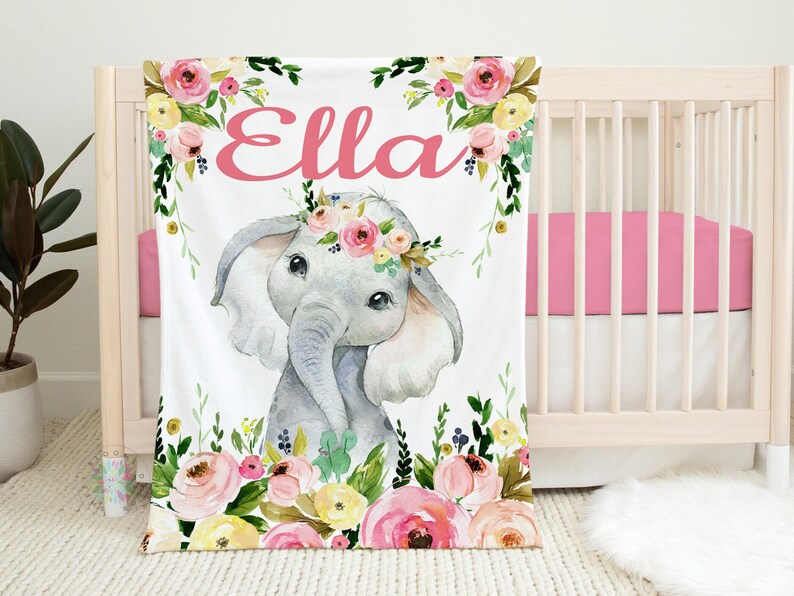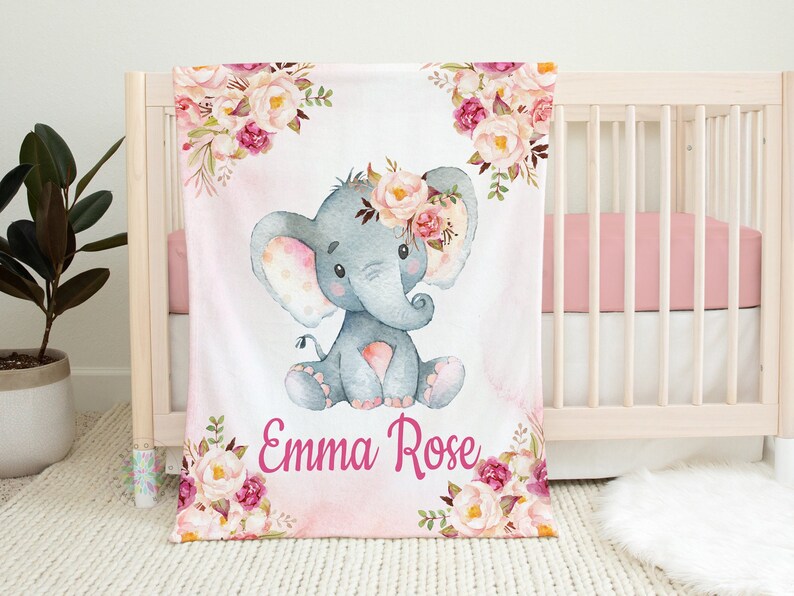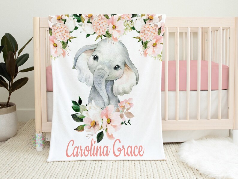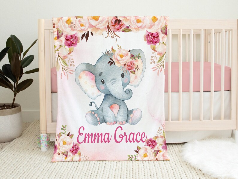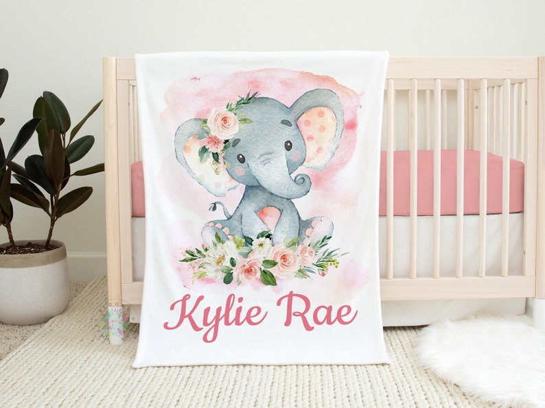 Floral Elephant Name Blanket Blush Pink Coral Watercolor Flowers Baby Shower Gift Nursery Newborb Todler Birthday Gift