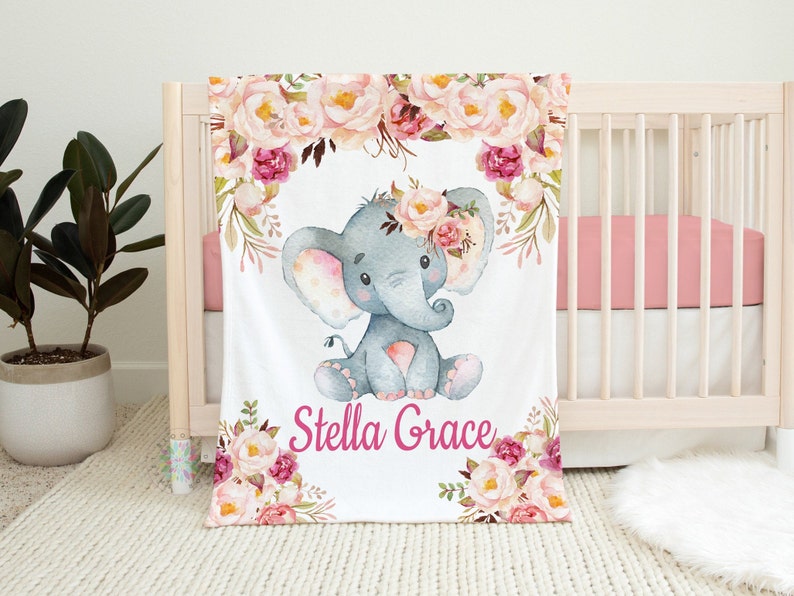 Elephants Baby Blanket, Personalized Blush Pink Floral Baby Name Blanket, Elephant Flowers Baby Shower Gift