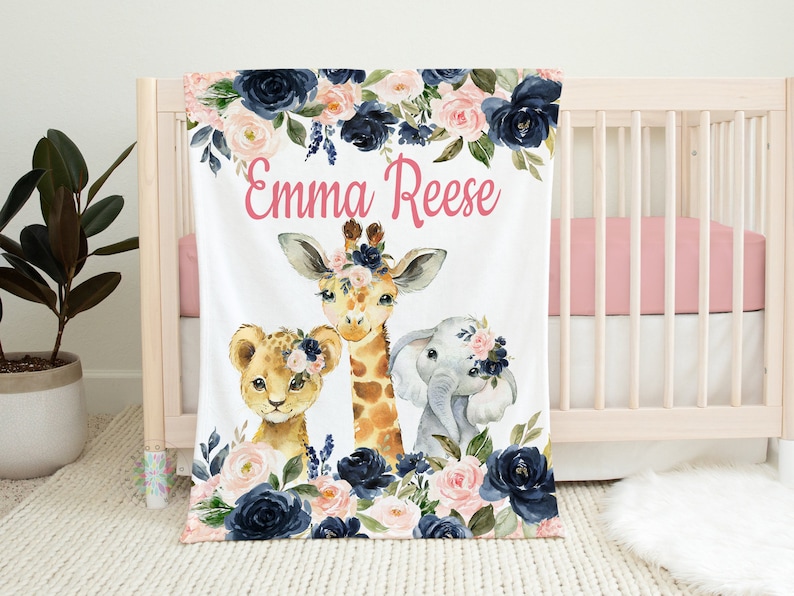 Safari Animals Floral Baby Name Blanket, Blush Pink Navy Blue Watercolor Florals Roses Jungle Animals Newborn Baby Shower Gift