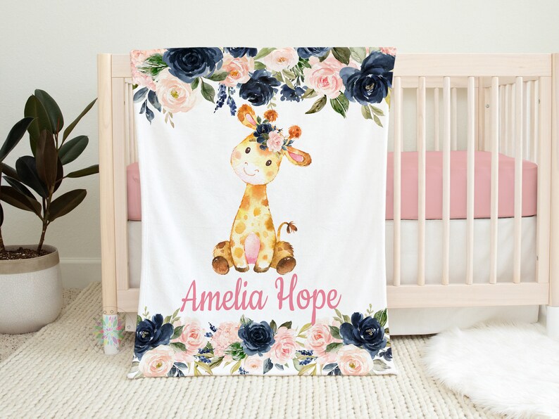 Giraffe Baby Blanket, Navy Blue Coral Blush Pink Flowers Name Personalized Swaddle Flowers Baby Shower Gift Blanket