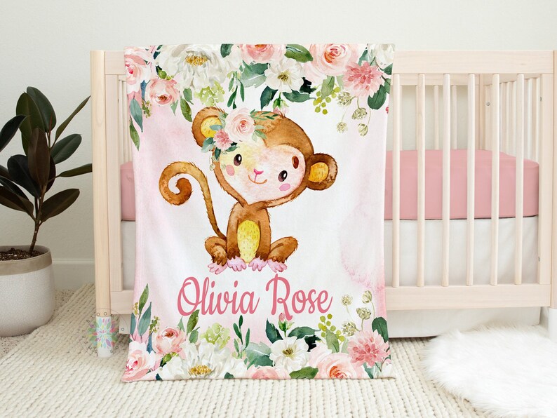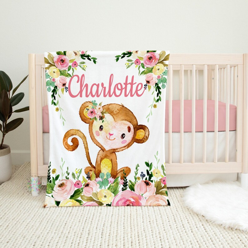 Monkey Baby Name Blanket Watercolor Coral Blush Pink Floral Roses Newborn Baby Name Monogram Flowers Baby Shower Gift Bedding