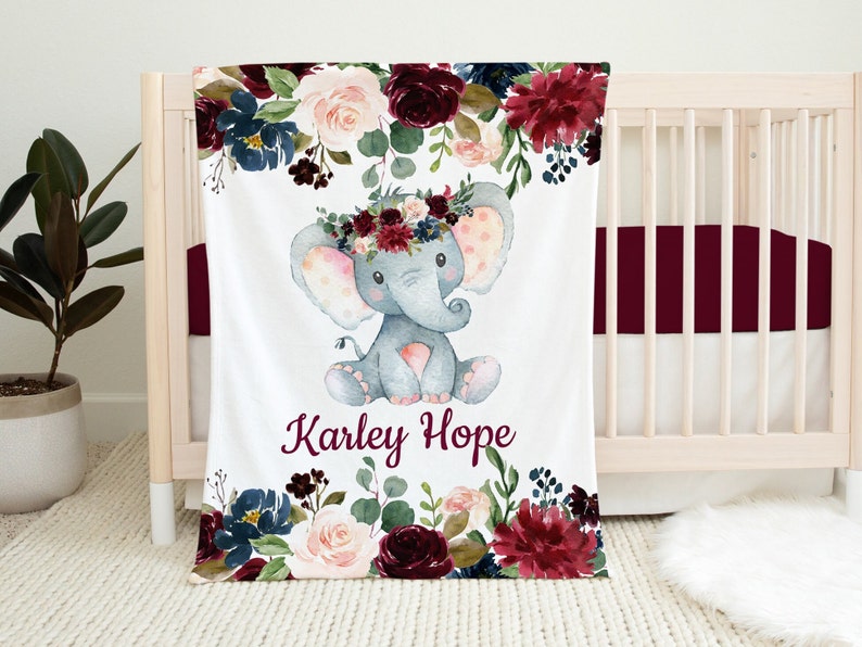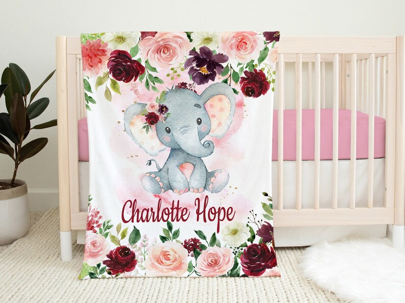Elephant Floral Name Blanket, Blush Pink Burgundy Red Navy Blue Maroon Watercolor Flowers Personalized Custom Baby Shower Gift
